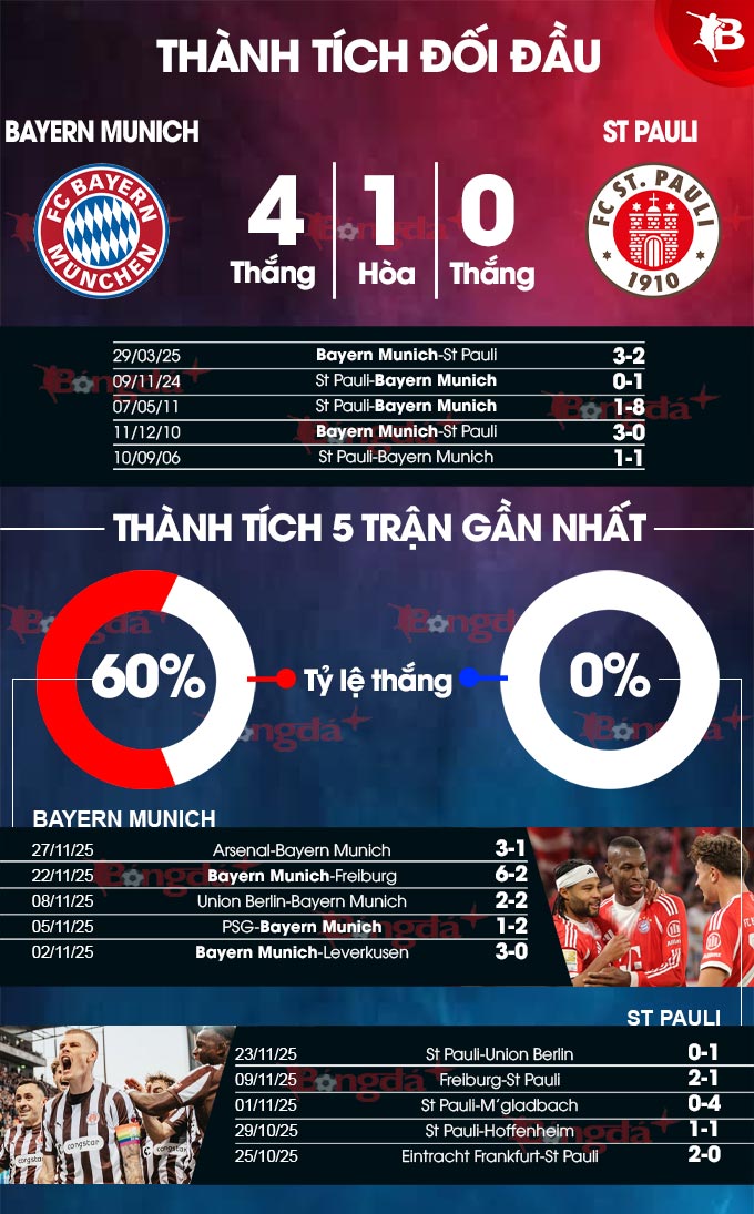 - Nhiều bàn thắng: Bayern Munich sở hữu hàng công bùng nổ với 41 bàn sau 11 trận, tức bình quân 4 bàn/trận. Lịch sử đối đầu cũng chứng kiến 2/3 trận gặp nhau gần nhất có tối thiểu 5 bàn, trong đó các chân sút chủ nhà ghi tới 12 bàn vào lưới St. Pauli.