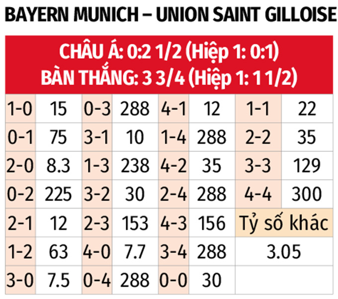 - Bayern Munich thua châu Á hiệp 1: Trên sân nhà, Bayern đang để thua châu Á 3 và hòa 1 trong 4 trận đấu gần đây trong hiệp 1 ở mọi đấu trường mình tham dự. Với Union SG, đội khách thắng châu Á 3 trong 4 trận ra quân vừa qua ở hiệp 1.