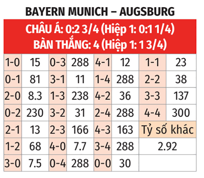 - Tỷ số chẵn: 4/5 trận gần đây của Augsburg kết thúc với tỷ số chẵn. 3 trận vừa qua của Bayern số bàn thắng cũng chia hết được cho 2.