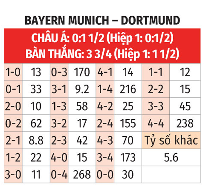 - Chẵn bàn thắng: 9/10 trận đối đầu gần nhất giữa Bayern vs Dortmund có tổng bàn thắng chia hết cho 2. Ngoài ra, 3/5 trận vừa qua của Bayern và 4/6 trận mới đây của Dortmund chứng kiến điều tương tự.