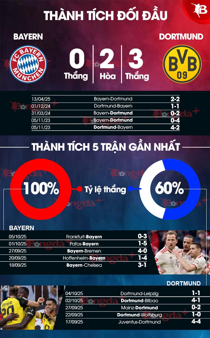 Vào thời điểm này, phong độ của Bayern vs Dortmund đang giống nhau. Trong khi Bayern toàn thắng 5 trận gần nhất thì Dortmund bất bại ở cùng thời gian.
