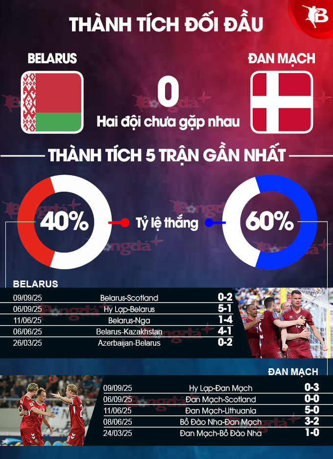 - Hai đội cùng ghi bàn: Belarus và Đan Mạch đã thành công trong việc ghi bàn ở 4/5 trận gần nhất. Bên cạnh đó, Đan Mạch cũng ghi bàn ở 3/4 trận chính thức gần nhất trên sân khách. Với xu hướng như vậy, khả năng cao hai đội sẽ cùng tìm được đường vào khung thành của nhau.