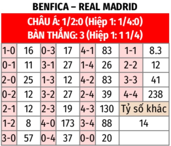 - Tối thiểu 2 bàn hiệp 1: 3 lần chạm trán giữa 2 đội gần đây đều có từ 2 bàn thắng trở lên trong hiệp 1. Tình trạng tương tự xảy ra ở 3/4 trận đấu gần đây của Benfica và 7/8 trận vừa qua của Real Madrid tại các giải đấu Cúp.