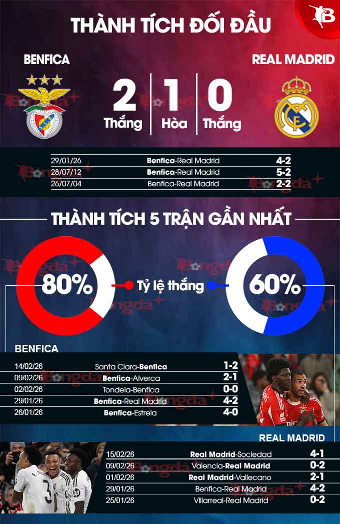 Nên biết rằng, trong quá khứ, Real Madrid luôn bị lép vế khi đối đầu với Benfica. Cụ thể, trong 3 cuộc đụng độ, đội bóng Hoàng gia Tây Ban Nha không biết mùi chiến thắng, khi hòa 1 và thua 2 trận, bao gồm thảm bại 2-4 ở vòng phân hạng Champions League 2025/26.