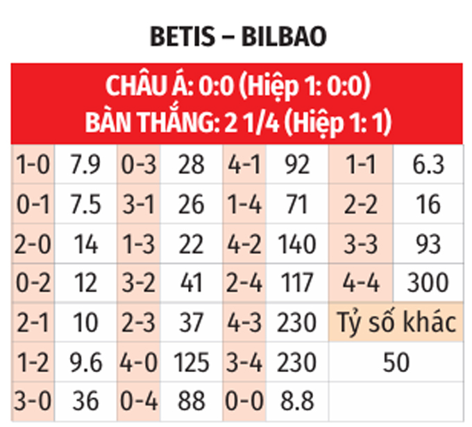 Phong độ của Betis vs Bilbao không có nhiều chênh lệch. Betis có lợi thế sân nhà nhưng Atletico được đánh giá vượt trội. Tuy nhiên, Bilbao chưa bao giờ "vui" khi hành quân tới sân của Betis. Có khả năng, trận đấu tới sẽ kết thúc với kết quả hòa.