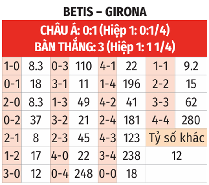 - Chẵn bàn thắng: 3/4 trận đối đầu gần nhất giữa Betis vs Girona có tổng bàn thắng chia hết cho 2. Ngoài ra, 8/10 trận vừa xong của Betis và 6/10 trận vừa qua của Girona đều chứng kiến điều tương tự.