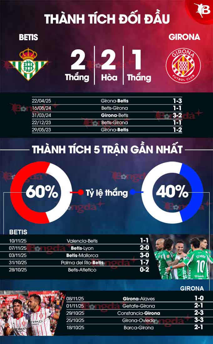 Betis có lợi thế sân nhà và có thành tích tốt tại đây khi chỉ thua 1/6 trận gần đây. Chiều ngược lại, Girona "sợ" sân khách khi chỉ thắng 1 lần kể từ khi mùa giải mới khởi tranh.