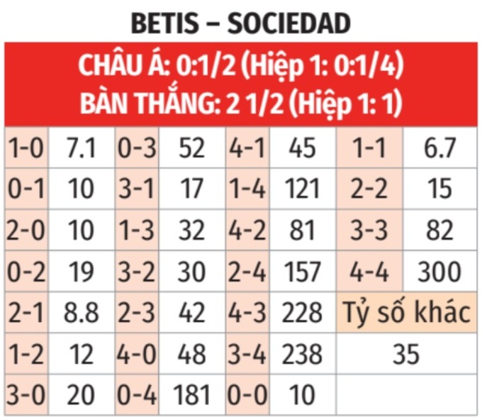 - T góc hiệp 1: 8/11 trận đấu gần đây của Betis đều có từ 5 quả phạt góc trở lên trong hiệp 1. Tình trạng tương tự xảy ra ở liên tiếp 9 trận sân khách vừa qua của Sociedad.