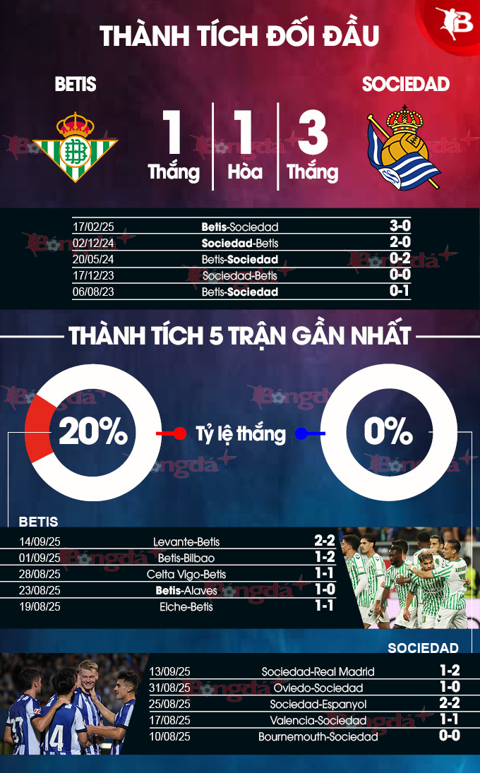 Càng có lý do để tin vào khả năng giành chiến thắng của Betis ở trận chiến lần này nếu nhìn vào quá khứ. Theo thống kê, trong 8 lần gần đây tiếp đón Sociedad trong khuôn khổ La Liga, họ chỉ phải nhận 2 thất bại. Đáng chú ý, trong lần gần đây nhất tiếp đón đội bóng xứ Basque ở lượt về La Liga mùa trước, Betis thắng vang dội 3-0.