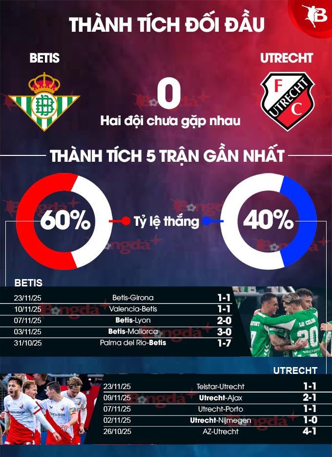 Trong khi Betis bất bại 5 trận gần nhất thì Utrecht chỉ thua 1/5 trận vừa xong. Trên sân nhà, Betis chỉ thua 1/5 trận mới đây còn Utrecht có kết quả không tốt ở sân khách khi không thắng 6 trận đã qua.