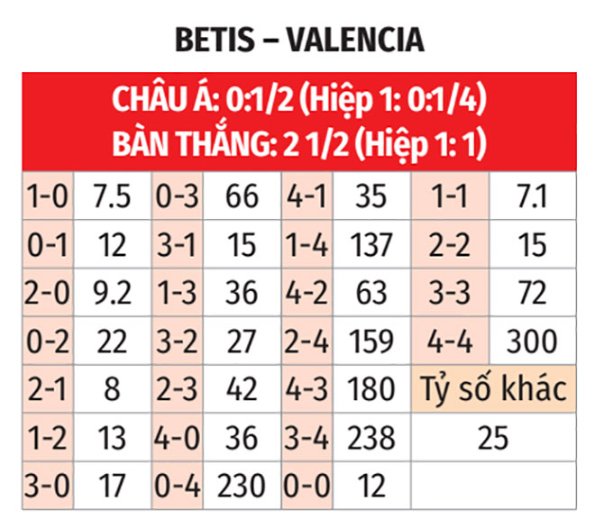 - Dưới 10 phạt góc: 5/6 trận gần đây giữa Betis và Valencia chỉ có tối đa 9 quả phạt góc. 4/6 trận vừa qua của Betis cũng diễn ra theo kịch bản tương tự.