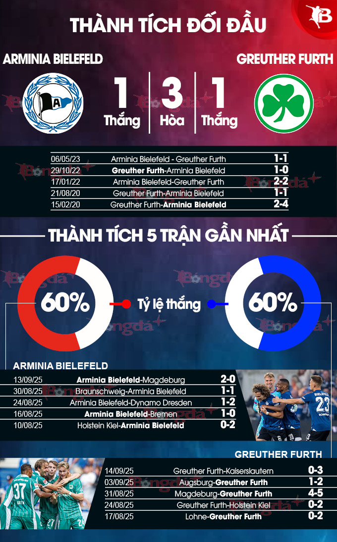 - Lưới rung 25 phút cuối: 3/4 trận chính thức vừa qua của Bielefeld có bàn thắng từ phút 65 trở đi. Chưa hết, 4/5 trận chính thức mới đây của Greuther Furth cũng chung kịch bản.