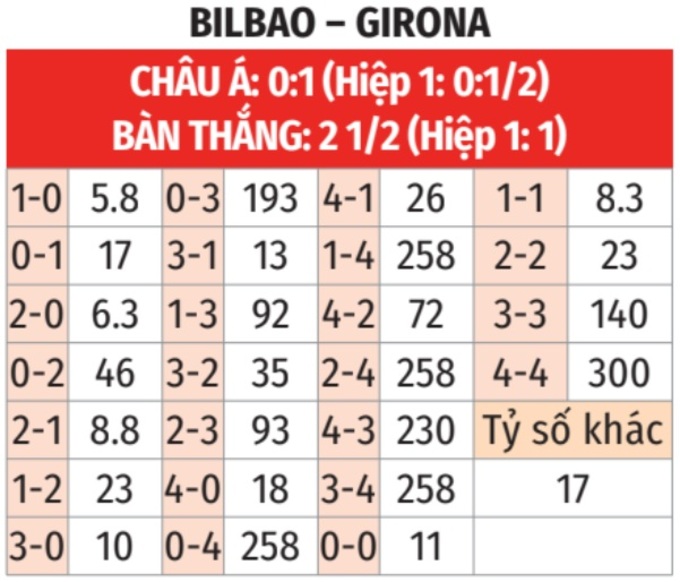 - Lẻ bàn thắng: 7/8 lần gặp giữa 2 đội gần đây kết thúc với tổng số bàn thắng là số lẻ. 7/9 trận gần đây của Bilbao và 7/9 trận sân khách mới nhất của Girona tương tự.