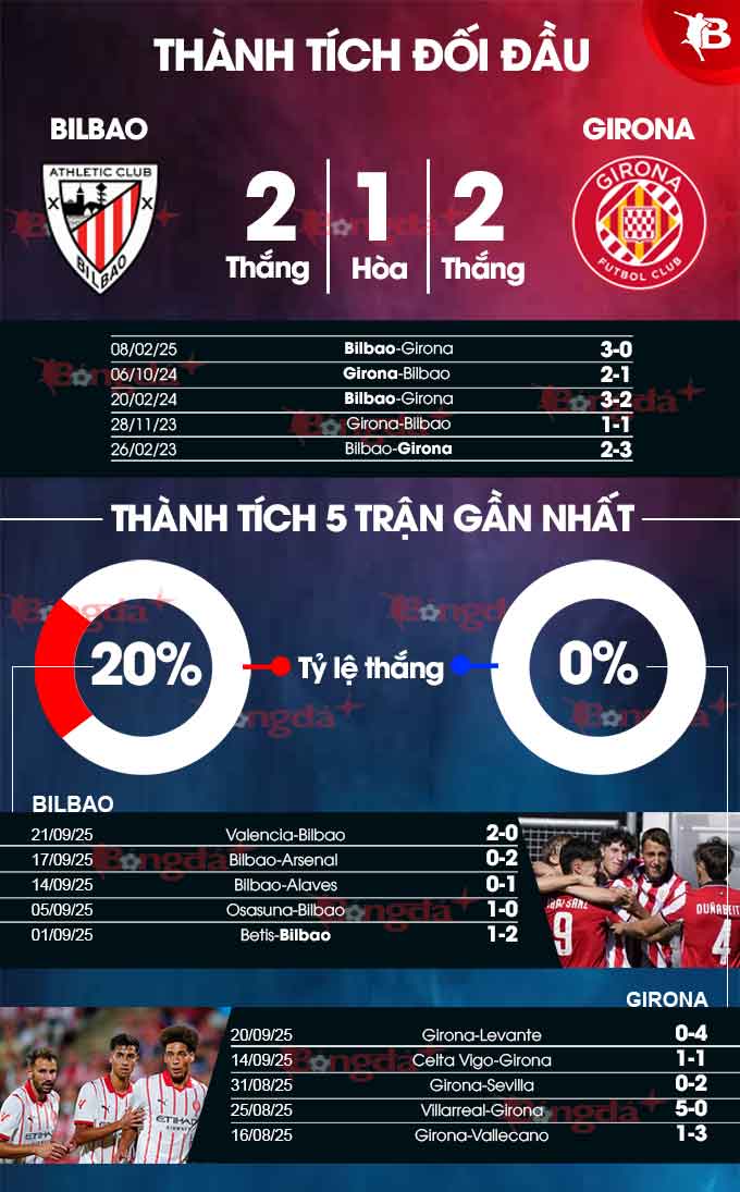 Nên nhớ rằng, trong quá khứ, Girona luôn gặp khó khăn khi phải thi đấu trên sân của Bilbao. Bằng chứng là trong 5 chuyến hành quân gần đây đến San Mames trong khuôn khổ La Liga, họ thua đội chủ nhà Bilbao 4 trận. Trong đó ở mùa trước, Girona bị thầy trò ông Ernesto Valverde vùi dập 3 bàn không gỡ.
