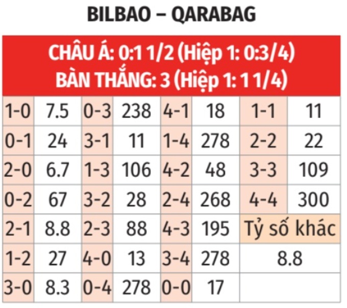 Bilbao sẽ đánh bại đội khách Qarabag với cách biệt từ 2 bàn trở lên. Hiệp 1 của trận đấu sẽ không có nhiều bàn thắng.