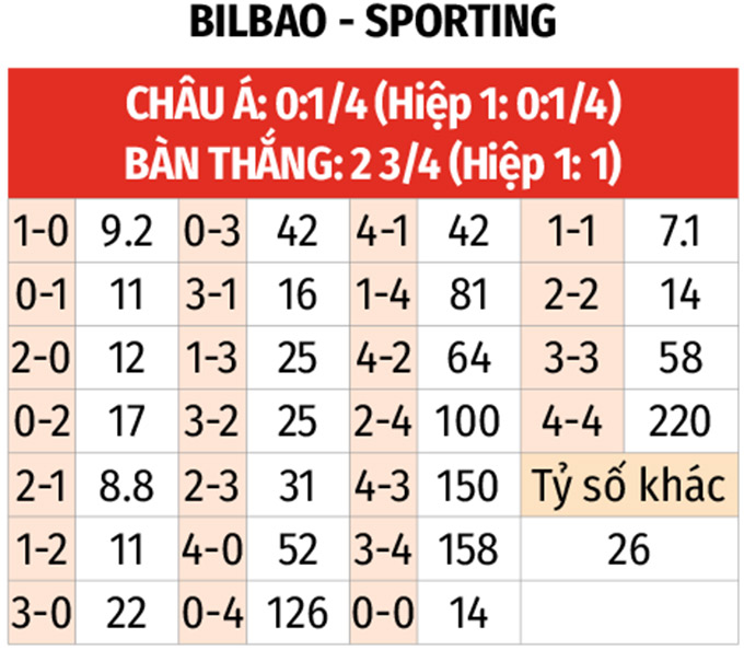 - Từ 3 bàn thắng trở lên: 6/7 trận gần đây của Bilbao cùng 5/6 trận vừa qua của Sporting Lisbon đều có ít nhất 3 bàn thắng được ghi. 3 trận đối đầu trong quá khứ cũng có tối thiểu 3 pha làm bàn.
