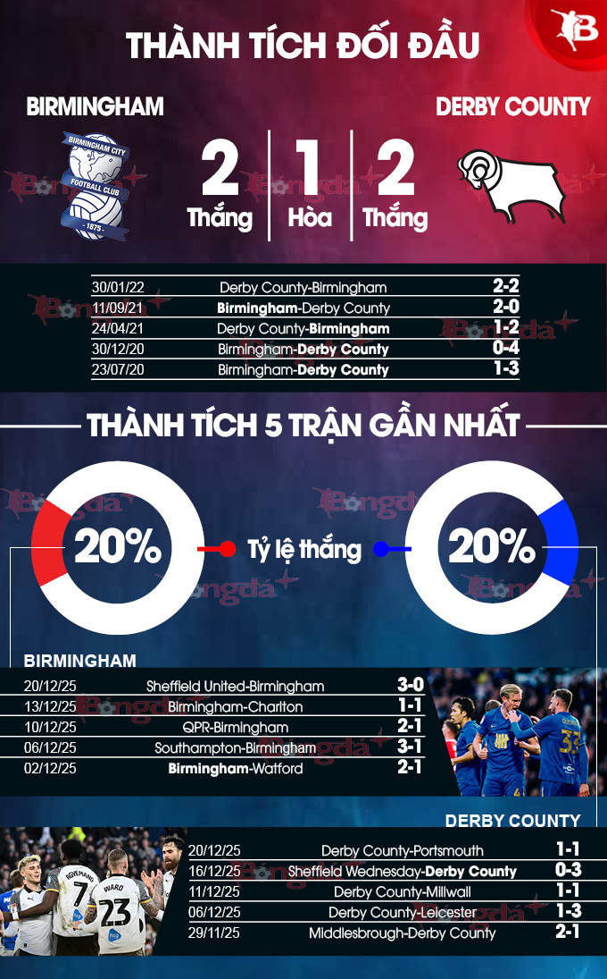 - Từ 3 bàn trở lên: 8/9 cuộc đối đầu gần nhất, 8/10 trận gần đây của cả Birmingham lẫn Derby County đều khép lại với ít nhất 3 bàn cả trận. Ngoài ra, 9/11 cuộc đụng độ gần đây tại Birmingham, 6/7 trận gần nhất trên sân nhà của Birmingham và cả 5 chuyến xa nhà vừa qua của Derby County cũng chứng kiến tối thiểu 3 lần lưới rung cả trận.
