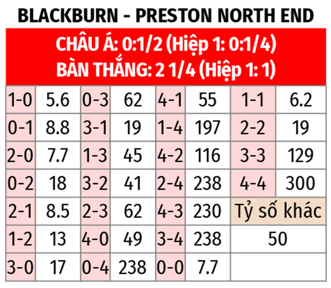 - Ít bàn thắng: 4/5 trận gần đây của Blackburn cùng 2/3 trận vừa qua của Preston đều có không quá 2 bàn thắng được ghi.