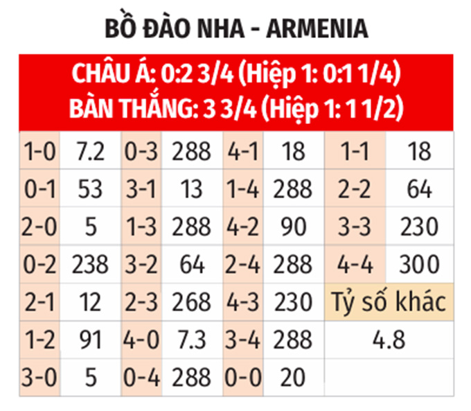 - Lẻ bàn thắng: Cả 4 cuộc đối đầu gần nhất giữa hai đội đều khép lại với tổng bàn thắng là lẻ. Hơn nữa, 6/9 trận gần đây của Bồ Đào Nha và 9/11 trận vừa qua của Armenia đều khép lại với tổng bàn thắng không chia hết cho 2. Ngoài ra, kết cục tương tự cũng xảy ra ở 6/8 trận sân nhà gần đây của Bồ Đào Nha và 7/11 chuyến làm khách vừa qua của Armenia.