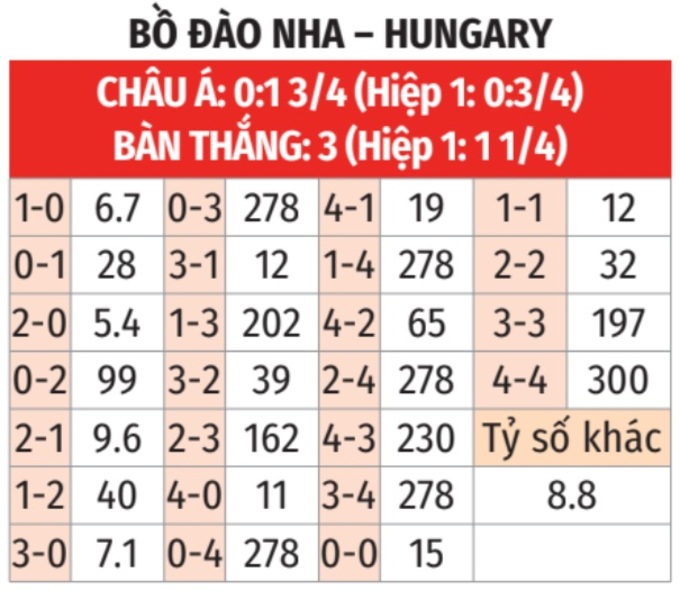 - Tối thiểu 3 bàn cả trận: 5/6 lần đối đầu giữa 2 đội gần đây đều kết thúc với từ 3 bàn thắng trở lên. 5/6 trận gần đây của Bồ Đào Nha và 4/5 trận chính thức vừa qua của Hungary xảy ra tình trạng tương tự.