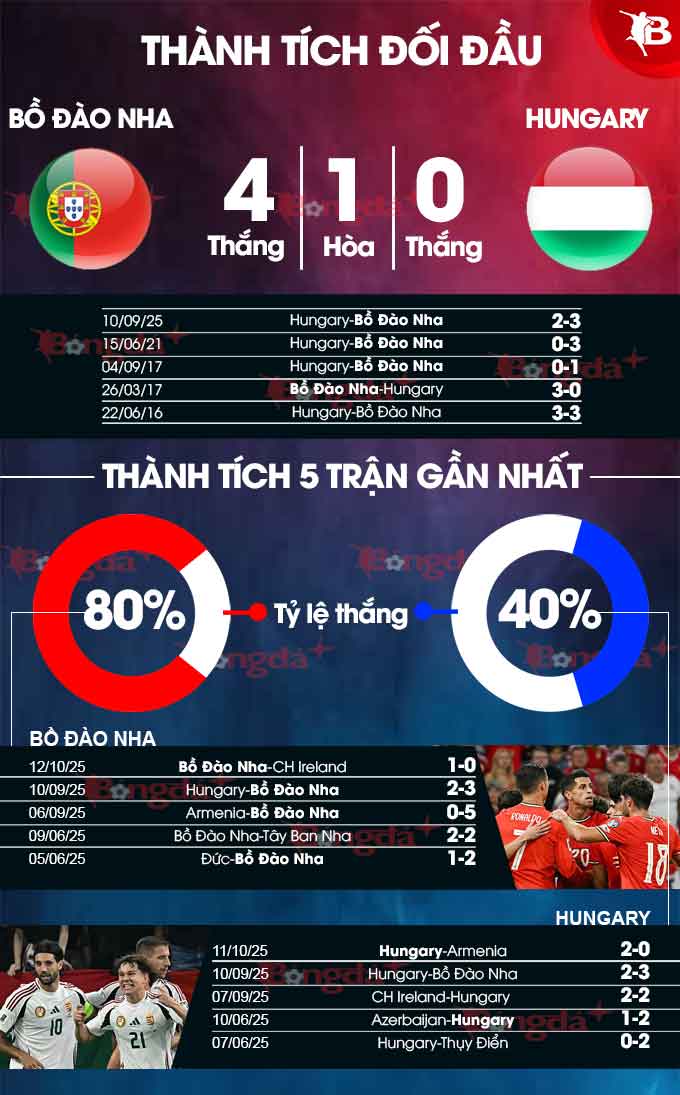 Sẽ rất khó để Hungary hy vọng làm nên bất ngờ trước Bồ Đào Nha ở trận đấu này. Phong độ gần đây của họ không thực sự tốt, dù vừa có chiến thắng 2-0 trước ĐT Armenia. Theo thống kê, trong 7 trận đấu chính thức trở lại đây, ngoài trận thắng trước Armenia vừa rồi, còn lại Hungary thua 4 và hòa 2. Đáng chú ý, trong 4 thất bại ấy, đội bóng xứ sở của các hoa hậu đều phải vào lưới nhặt bóng ít nhất 2 lần.