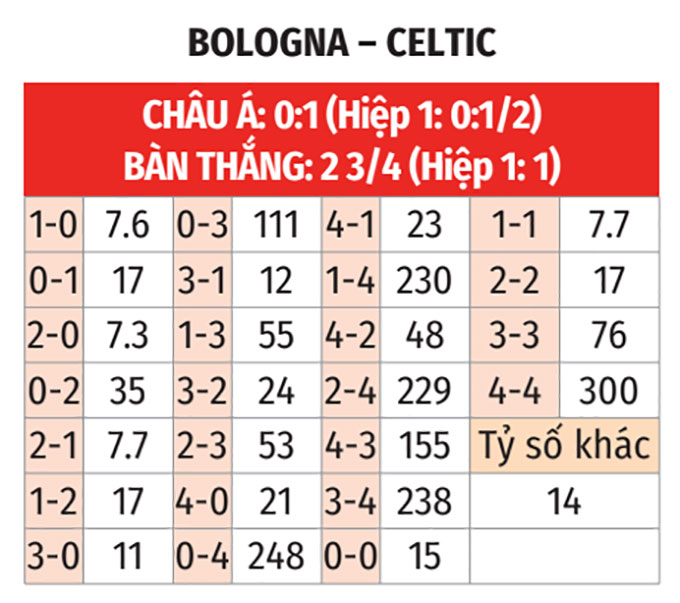 - Tỷ số chẵn: 6/8 trận vừa qua của Bologna kết thúc với tỷ số chẵn. 6/7 trận gần đây của Celtic số lần lưới rung cũng chia hết được cho 2.