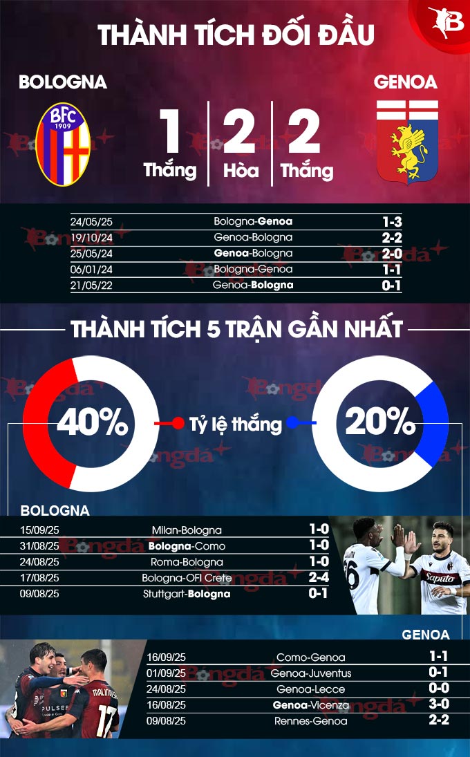 Việc đánh bại Genoa càng trở nên khó khăn cho Bologna nếu nhìn vào thành tích đối đầu. Lần gần nhất Bologna giành 3 điểm trên sân nhà trước Genoa đã cách đây 7 năm với thắng lợi 2-0 vào tháng 2/2018. Trong 6 lần liên tiếp chào đón Genoa tại sân Renato Dall’Ara, Bologna có thành tích hòa 3 và thua 3. Do vậy nếu Genoa có điểm ra về thì cũng không có gì bất ngờ.
