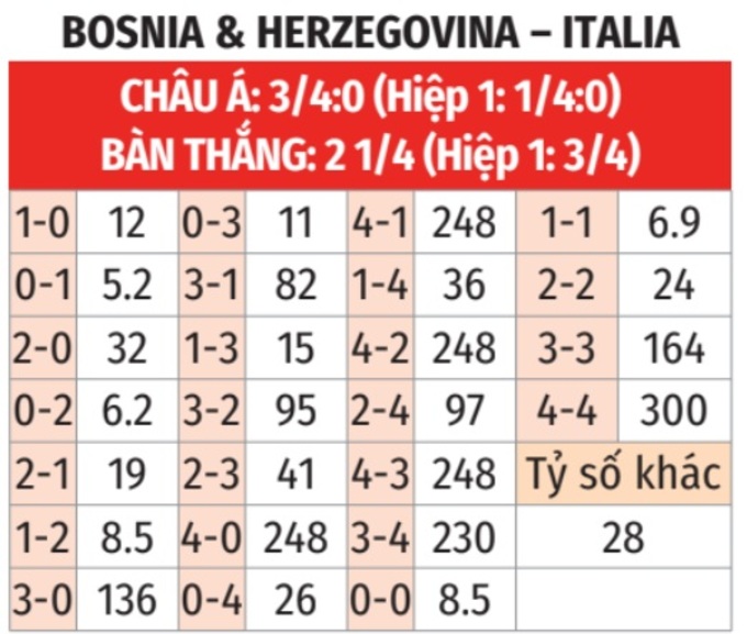 - Tối thiểu 1 bàn hiệp 1: 3/4 lần gặp giữa 2 đội gần đây có từ 1 bàn thắng trở lên trong hiệp 1. Tình trạng tương tự xảy ra ở 4/5 trận gần đây của Bosnia và 15/18 trận vừa qua của Italia.