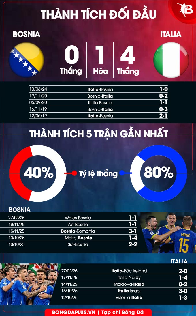 Đây là trận đấu trực tiếp tranh vé dự VCK World Cup 2026, nên tính chất sẽ vô cùng khốc liệt. Chắc chắn, thầy trò HLV Gattuso sẽ có một chuyến đi không hề dễ dàng. Tuy nhiên, Azzurri có lý do để tự tin vào chiến thắng. Thứ nhất, họ có sự ủng hộ của lịch sử. Theo thống kê, trong 5 cuộc đụng độ giữa 2 đội gần đây, Italia áp đảo với thành tích hòa 1, thắng 4. Trong đó, có 3 trận họ không để Bosnia có bàn danh dự.