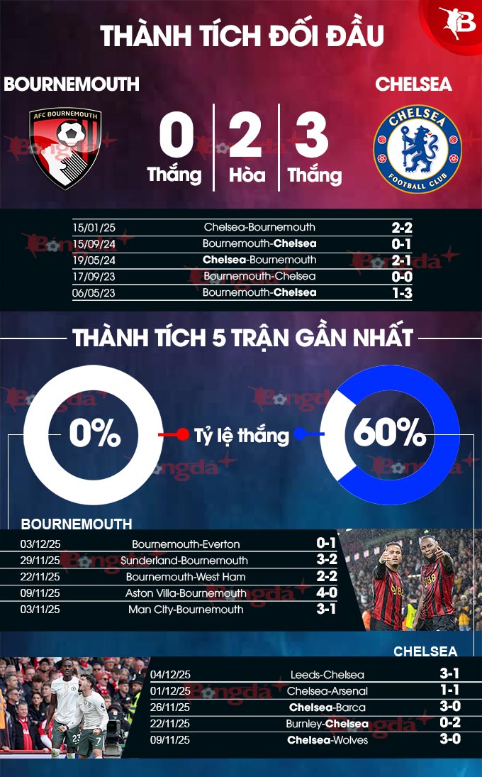 - Tối thiểu 3 bàn cả trận: 5/8 cuộc đối đầu gần nhất giữa hai đội, 7/9 trận gần đây của Bournemouth và 15/20 trận vừa qua của Chelsea đều có ít nhất 3 lần lưới rung cả trận. Không những thế, 9/11 trận làm khách vừa qua của Chelsea cũng khép lại với tối thiểu 3 bàn cả trận.