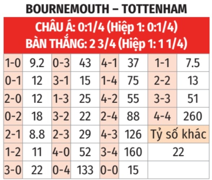 - Tối đa 1 bàn hiệp 1: 5 lần gặp giữa 2 đội gần đây chỉ có nhiều nhất 1 bàn thắng trong hiệp 1. 3/4 trận sân nhà gần đây của Bournemouth và 5/7 trận vừa qua của Tottenham xảy ra tình trạng tương tự.