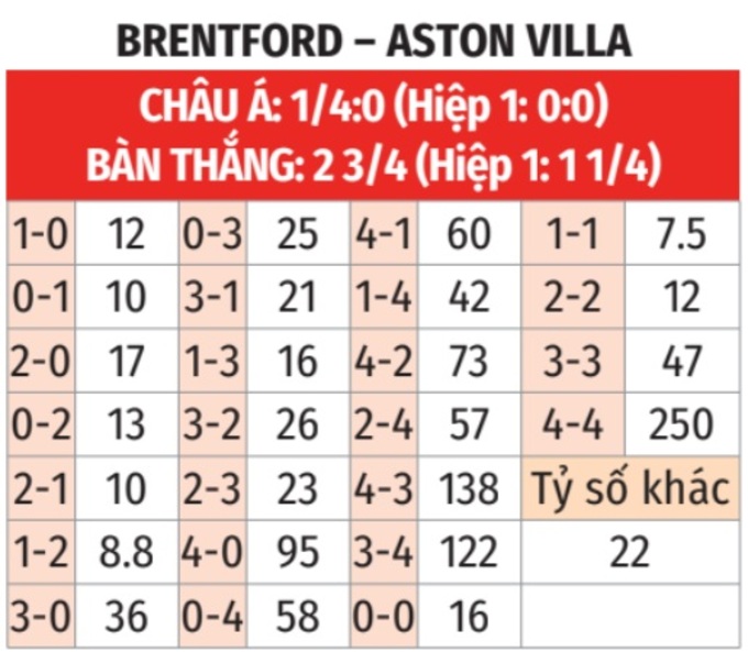 - X hiệp 1: 4/5 lần gặp giữa 2 đội gần đây chỉ có tối đa 1 bàn thắng trong hiệp 1. Tình trạng tương tự xảy ra ở 6/7 trận gần đây của Brentford và 5 trận gần nhất của Aston Villa.
