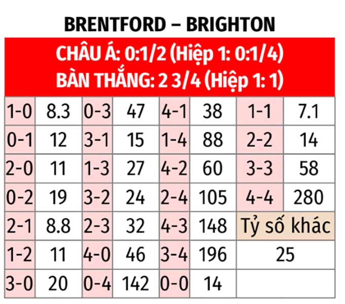 - Tỷ số chẵn: 6/8 trận sân nhà gần đây của Brentford kết thúc với tỷ số chẵn. 3/4 trận gần nhất giữa đội bóng này và Brighton cũng diễn ra theo kịch bản tương tự.