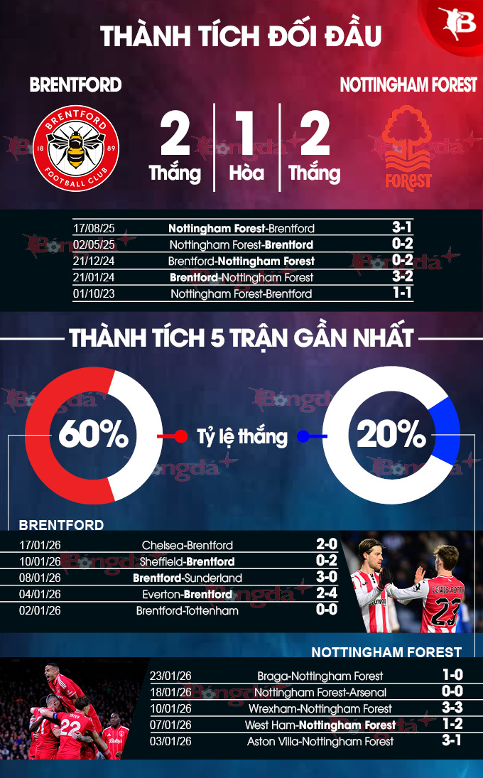 Ở trận đấu cuối tuần này, Brentford lại có lợi thế sân nhà khi tiếp đón Nottingham Forest. Đây là yếu tố quan trọng. Theo thống kê, các học trò của ông Andrews đang trải qua mạch 7 trận bất bại tại giải Ngoại hạng Anh, trong đó giành 5 chiến thắng. Gần đây nhất, Brentford đánh bại Sunderland 3-0 trên sân nhà.