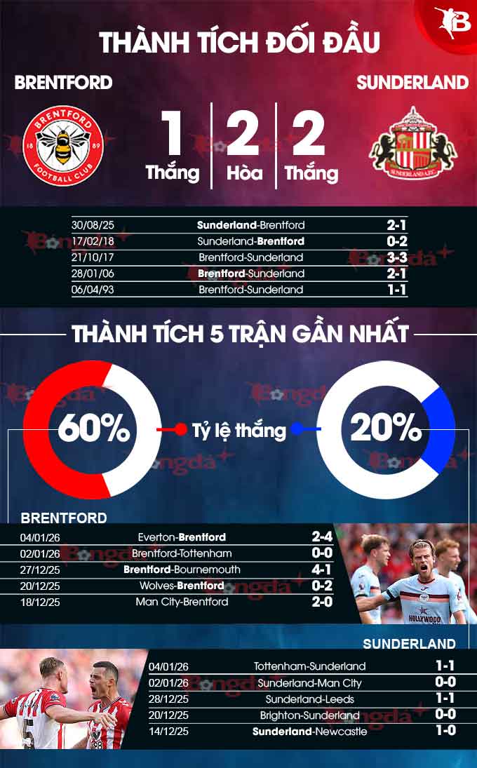 Trong khi đó, Sunderland của Regis Le Bris đã có một mùa giải đầu tiên xuất sắc khi trở lại giải đấu hàng đầu xứ sương mù, và mặc dù người hâm mộ đã hài lòng với việc trụ hạng, nhưng mục tiêu của CLB cho phần còn lại của mùa giải còn cao hơn nhiều. Sunderland bước vào trận đấu này ở vị trí thứ 8, có cùng 30 điểm với Brentford, và đang có chuỗi 5 trận bất bại liên tiếp.
