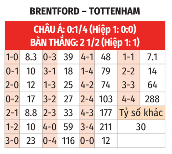 - Brentford thua theo châu Á hiệp 1: Trong khi Tottenham thắng theo châu Á hiệp 1 ở 4/5 trận gần nhất, thì điều ngược lại diễn ra với Brentford ở 6/7 trận vừa qua. Đã vậy, Brentford còn đang có chuỗi 3 trận thua liên tiếp theo châu Á hiệp 1 khi đụng độ Tottenham, nên họ không phải là lựa chọn đáng tin trước giờ nghỉ.