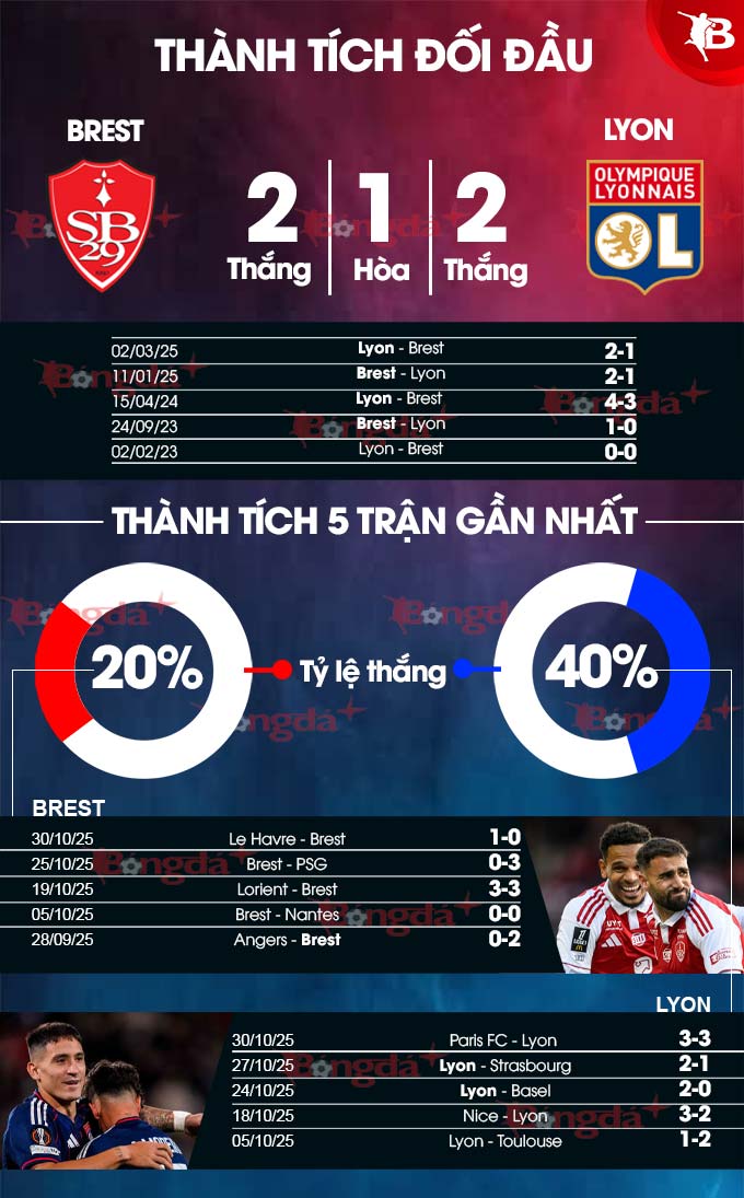 - Ít nhất 3 bàn cả trận: 5/7 trận đối đầu gần nhất, 5/8 trận vừa qua của Brest và cả 4 trận gần đây của Lyon đều có tối thiểu 3 lần lưới rung cả trận. Ngoài ra, 5/6 cuộc đối đầu gần đây tại Brest, 4/5 trận sân nhà vừa qua của Brest và 3/4 chuyến làm khách gần nhất của Lyon tại Ligue 1 cũng đều chứng kiến ít nhất 3 bàn cả trận.