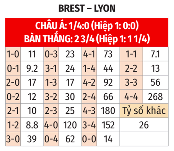 - Hiệp 1 từ 2 bàn trở lên: Cả hai cuộc đối đầu gần nhất, 5/7 trận vừa qua của Brest và 2/3 trận gần đây của Lyon tại Ligue 1 đều có ít nhất 2 bàn thắng trong hiệp 1. Kịch bản tương tự cũng xảy ra ở 4/6 cuộc đối đầu vừa qua tại Brest, ở 5/6 trận sân nhà gần đây của Brest. Trận này khó có ngoại lệ.