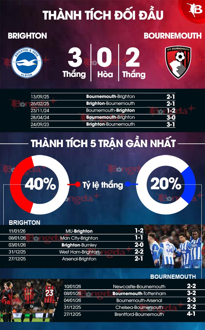 Trận lượt đi hồi tháng 9 đã kết thúc với chiến thắng 2-1 nghiêng về Bournemouth, mang đến cho đội bóng của HLV Andoni Iraola cơ hội hiếm hoi để hoàn thành cú đúp chiến thắng trước Brighton lần thứ hai trong lịch sử Premier League. Tuy nhiên, đây sẽ là nhiệm vụ không hề dễ dàng khi sân Amex luôn là nơi mà họ gặp rất nhiều thách thức với 4 lần gần nhất viếng thăm toàn thua.