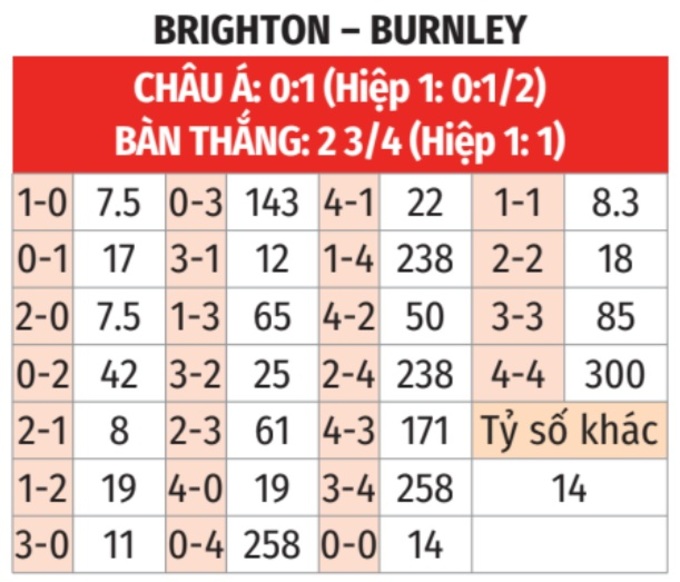 - Tối thiểu 3 bàn cả trận: 6/8 trận đấu sân nhà gần đây của Brighton đều xuất hiện từ 3 bàn thắng trở lên. Tình trạng tương tự xảy ra ở 8/9 trận sân khách mới nhất của Burnley.