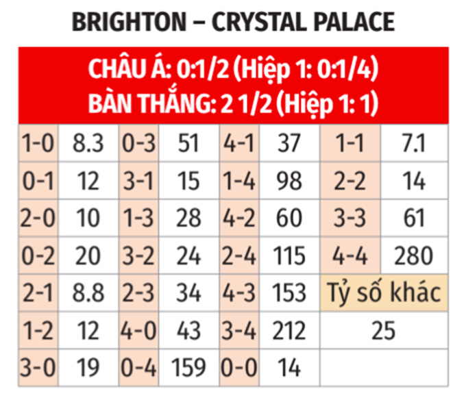 - Hiệp 1 không quá 1 bàn: 10/13 cuộc đối đầu gần nhất, 8/9 trận gần đây của Brighton và 10/12 trận vừa qua của Crystal Palace đều có tối đa 1 bàn trong hiệp 1. Hơn nữa, 8/9 trận sân nhà gần đây của Brighton cũng chứng kiến nhiều nhất 1 bàn trong hiệp 1.