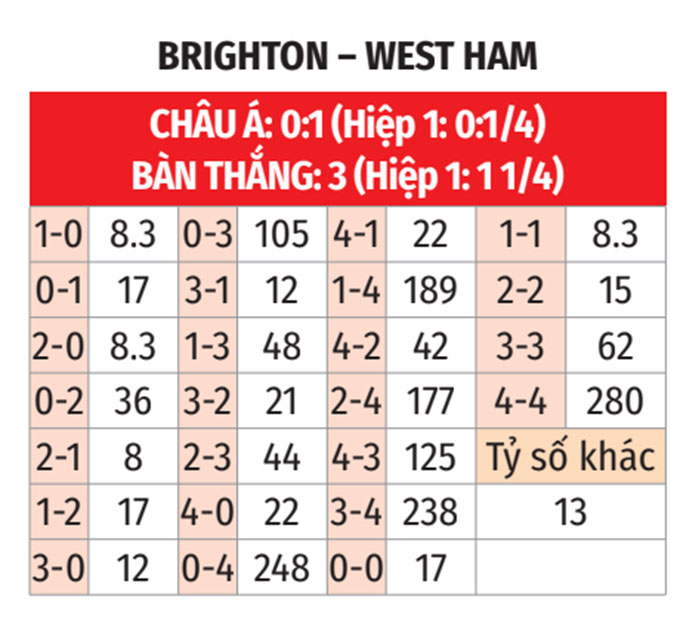 - Tối đa 1 bàn hiệp 1: 5/6 trận gần đây của Brighton chỉ có tối đa 1 bàn trong hiệp 1. Cả 10 trận gần nhất giữa họ và West Ham cũng diễn ra theo kịch bản này.