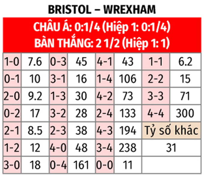 - Chẵn bàn thắng: 5/7 trận gần nhất của Bristol City có tổng bàn thắng chia hết cho 2. Ngoài ra, 6/10 trận sân khách vừa xong của Wrexham cũng chứng kiến điều tương tự.