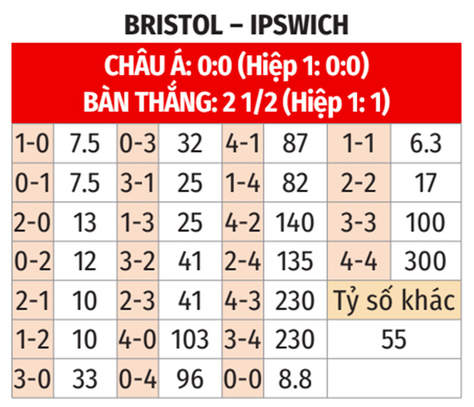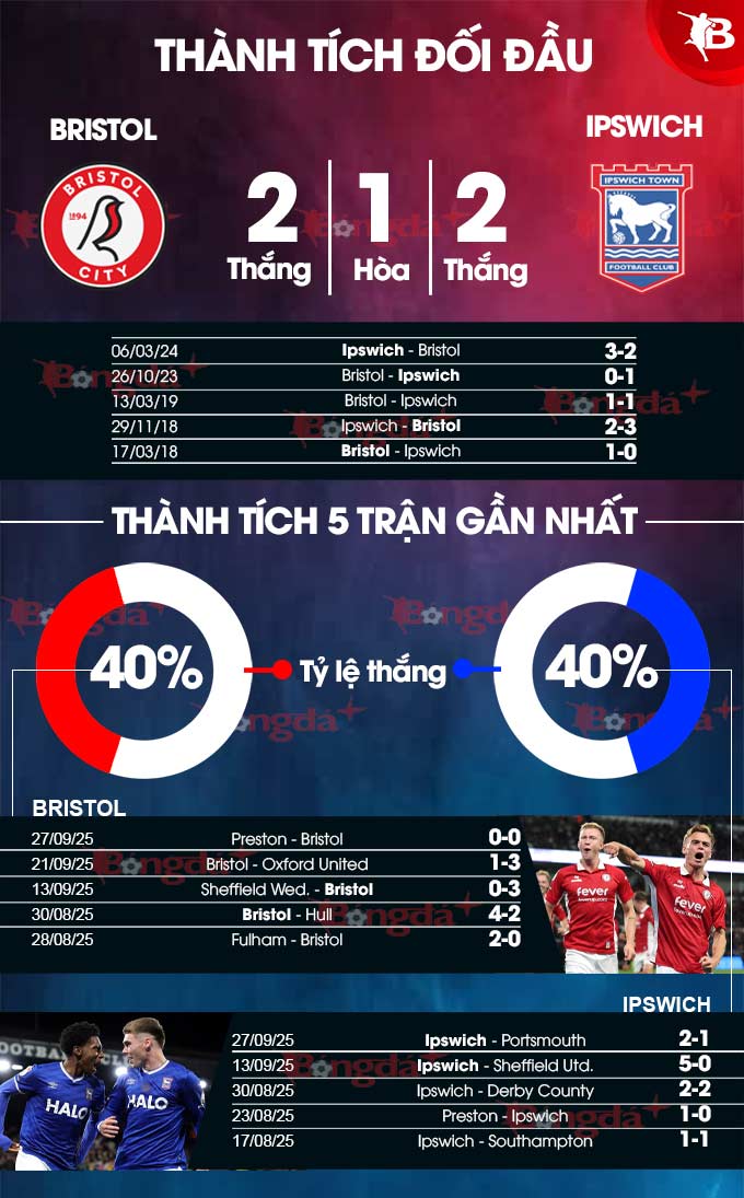 - Ipswich ghi bàn hiệp 1: Ipswich ghi ít nhất 1 bàn trong hiệp 1 ở 4/5 trận gần nhất và ở 5/7 cuộc đối đầu vừa qua. Trong khi đó, Bristol lại để thủng lưới trong hiệp 1 ở 4/6 trận gần đây, ở cả 2 trận sân nhà vừa qua.