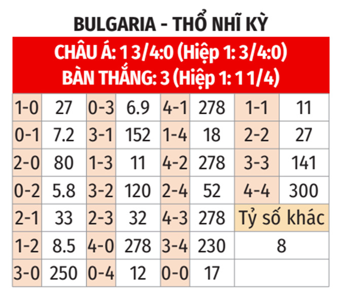 - Thổ Nhĩ Kỳ thắng theo châu Á: Thổ Nhĩ Kỳ thắng theo châu Á 4/5 trận đối đầu gần nhất, thắng 3/4 trận chính thức gần đây, thắng 4/5 chuyến làm khách vừa qua. Còn Bulgaria thua 6, hòa 1 ở 7 trận gần đây; thua cả 5 trận sân nhà gần nhất. Do đó, những người yêu mến Thổ Nhĩ Kỳ có thể đặt niềm tin vào họ ở trận này.
