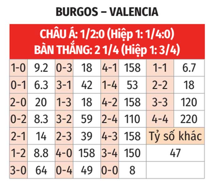 - Tỷ số chẵn: 3/4 trận gần đây của Burgos kết thúc với tổng tỷ số chẵn. 3/4 trận vừa qua của Valencia cũng có số bàn thắng chia hết cho 2.