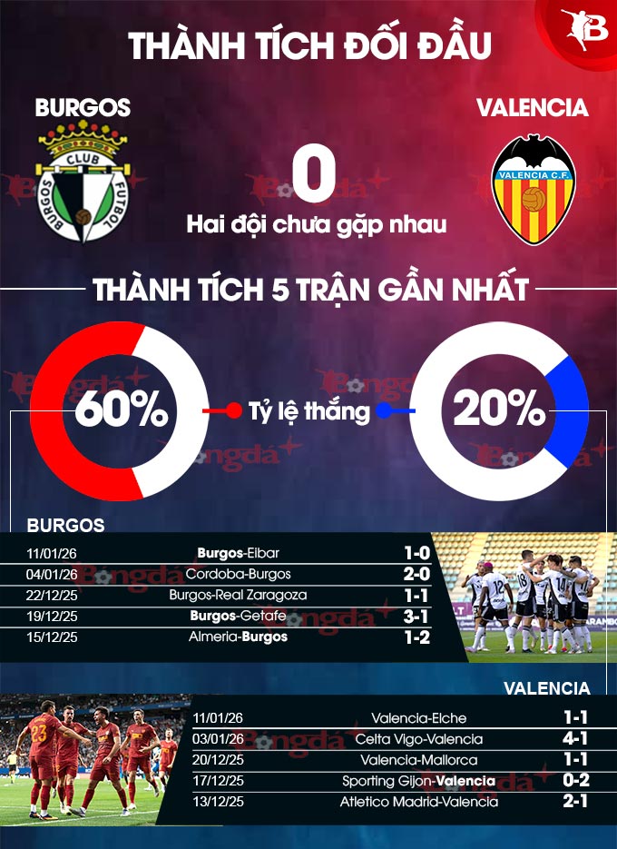 Chỉ là đội bóng góp mặt ở giải hạng 2 Tây Ban Nha, Burgos còn phải nỗ lực nhiều mới xứng đáng là đối thủ của Valencia. Trong quá khứ, chưa bao giờ họ tiến xa hơn vòng 16 đội ở cúp Nhà vua Tây Ban Nha và quy luật này nhiều khả năng sẽ lặp lại.