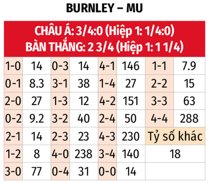 - Ít bàn thắng: 3/4 trận gần đây của Burnley cùng 3 trận liên tiếp vừa qua của MU đều có tối đa 2 bàn thắng. 4/5 trận đối đầu gần nhất cũng xuất hiện không quá 2 lần lưới rung.