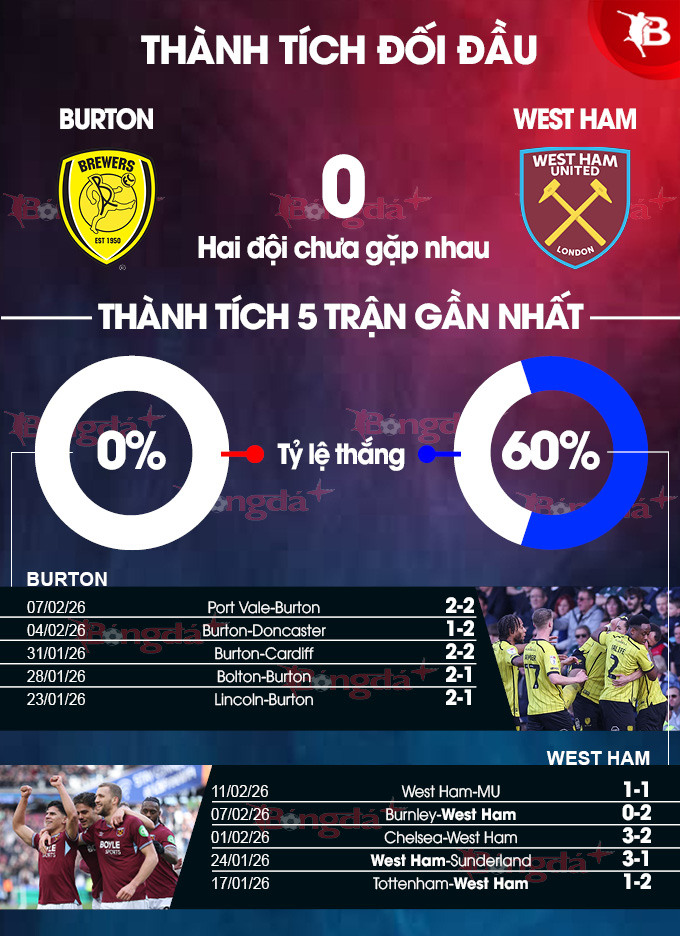Burton rõ ràng là không cùng đẳng cấp với West Ham. Đội bóng này chỉ đang chơi ở giải hạng Hai Anh, tức kém West Ham 2 hạng đấu. Burton cũng đang không có phong độ cao khi đã 5 trận liền không thắng, nhận 3 thất bại. Tính rộng hơn, Burton cũng thua 6, chỉ thắng được 1/10 trận gần nhất. Hiện tại, ở giải hạng Hai thì Burton cũng đang đứng thứ 21, nằm trong nhóm các CLB có nguy cơ phải xuống hạng Ba.