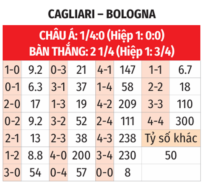 - Chẵn bàn thắng: 3/5 trận gần nhất của Cagliari có tổng bàn thắng chia hết cho 2. Ngoài ra, 3 trận vừa qua của Bologna cũng chứng kiến điều tương tự.